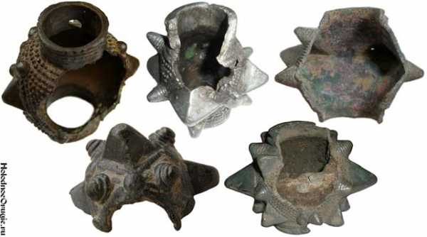 Однако развитие шло не только по линии упрощения. Тогда же, в XII – XIII веках, появились навершия весьма сложной и совершенной формы — с шипами, торчащими во всех направлениях таким образом, чтобы на линии удара в любом случае оказался выступ – один или несколько. Эти навершия в основном отливали из бронзы, что первоначально ввело ученых в досадное заблуждение: в музейных каталогах и даже в научных трудах их причисляли к эпохи бронзы только на том основании, что они были сделаны из упомянутого металла!