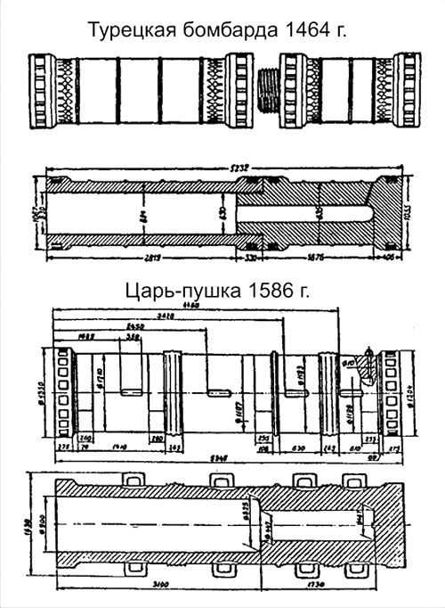 Как интересно, что первые же в истории орудия (бомбарды), сразу имели прогрессивный способ заряжания с казённой части. Казённик часто крепился к стволу с помощью резьбы, то есть, ввинчивался. Такая конструкция некоторое время сохранялась и в литых орудиях. Посмотрите на Рис. 6. Здесь сравнивается турецкая бомбарда и Царь-пушка. По геометрическим параметрам они очень похожи, но Царь-пушка, отлитая на сотню лет позже, уже выполнена неразъёмной. Значит в 15…16 веках перешли на более примитивное дульное заряжание.