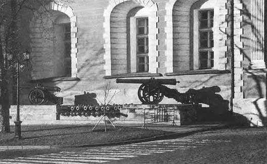 Н.В. Гордеев, автор интересной книги «Царь-Пушка», сообщает: «В России первые орудия появились в XIV веке» [48], с. 7. Составитель и автор книги «Московский Кремль в старину и теперь», С. Бартенев, писал: «Стены и стрельницы Кремля в XVI веке… обставились крепостной артиллерией самого разнообразного состава, среди которых находились чугунные, железные и медные орудия, начиная от самых малых, стрелявших небольшими пулями… и кончая орудиями 6 — 8-фунтового калибра (2400 г и 3200 г), помещавшимися по одному в каждом этаже башни. Кроме того, внизу на земле лежали ГРОМАДНЫЕ ЧУДОВИЩА, ГИГАНТСКИЕ БОМБАРДЫ» [27], т. 1, с. 40. Цит. по [48], с. 8.
