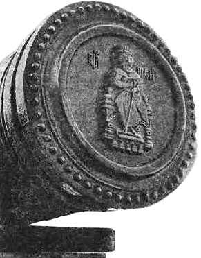 Рис. 7.8. Другая большая московская пушка «Троил», отлитая в XVII веке. «Деталь с изображением ТРОЯНСКОГО ЦАРЯ. Пушка „Троил“. Мастер Яков Дубина. 1685 г.» [48], с. 28. Взято из [48], с. 28.