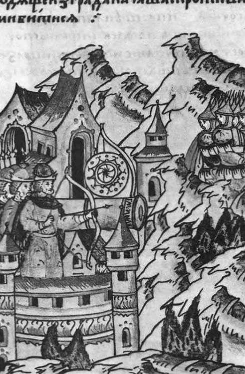 Рис. 7.11. Огромные русско-ордынские пушки XV века. Миниатюра летописного свода якобы XVI века, изображающая оборону Москвы якобы 1451 года. Взято из [100], с. 73.