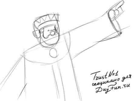 Этап 4. От головы вниз по листу бумаги рисуем туловище царя. Две плавные линии от шеи вниз и наметим линии рук.