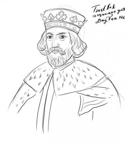 Шаг пятый. Основная подготовка закончилась, осталось добавить мех на царский плащ, зарисовать корону разными прибамбасами и отточить черты лица.