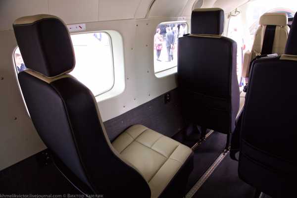 А теперь войдем в салон как пассажиры. Самолет имеет несколько вариантов компоновки пассажирских кресел. В данном случае представлен 11-местный вариант по типу 1+2, есть также 14-местный. Варианты на 10 и 13 мест 1+1 с широким проходом.