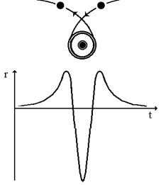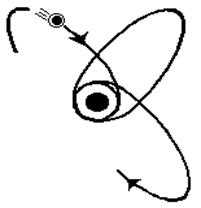 Если тело вдали от черной дыры имеет скорость много меньше световой и его орбита пролегает близко к окружности с радиусом, равным двум гравитационным, то оно облетит вокруг черной дыры несколько раз, прежде чем снова улетит в космос (рис. 10.6).