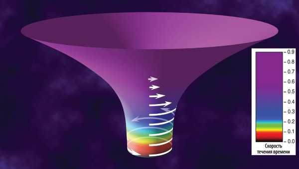 Искривленная форма поверхности на рис. 5.5 в точности такова, какой мы бы видели экваториальную плоскость дыры из балка. Изменяющиеся цвета отображают замедление времени, как если бы его замерял некто, зависнув на постоянной высоте над горизонтом. В области перехода от синего цвета к зеленому скорость течения времени составляет 20 процентов от его скорости вдалеке от дыры. В области перехода от желтого к красному время замедляется до 10 процентов от его «нормальной» скорости. А у самого подножия, в районе черной окружности, время замирает. Это горизонт событий; он выглядит как окружность, а не как сфера, поскольку мы рассматриваем лишь экваториальную плоскость и используем только два измерения нашей Вселенной (нашей браны). Если бы мы восстановили третье пространственное измерение, горизонт выглядел бы сплюснутой сферой – сфероидом. Скорости, с которой пространство закручивается вокруг черной дыры, показаны белыми стрелками: на горизонте событий пространственный вихрь вращается быстро, а по мере того, как мы будем подниматься на космическом корабле вверх, он будет замедляться.
