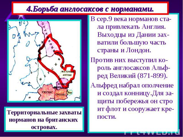 Завоевания норманнов растянулись на три столетия. В результате были покорены в IX веке части Ирландии и Шотландии. Постоянные попытки завоевать Англию привели к тому, что в IX-X веках норманнами была занята северная, восточная и центральная части страны. И называлась завоеванная территория Danelare («Область датского права»).