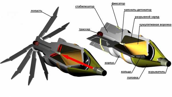 смеси, разбрасывание детонаторов, взрыв детонаторов). Из носовой части бомбы опускался тросик длиной 5-7 метров с грузиком. Уменьшение натяжения тросика при касании им земли и вызывало начало