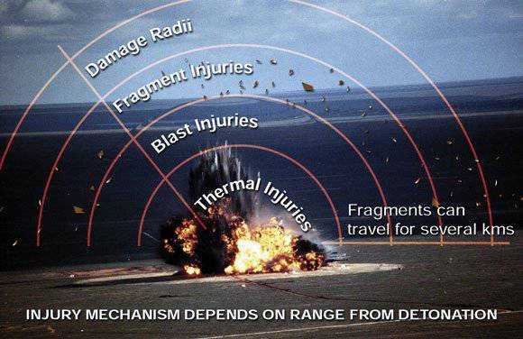 Однако самым загадочным поражающим фактором объемных боеприпасов является волна пониженного давления, которая следует за ударным фронтом. О ее действии существует большое количество самых противоречивых мнений. Есть данные, что именно зона пониженного давления оказывает самое разрушительное действие. Однако это кажется маловероятным, так как перепад давления составляет всего лишь 0,15 атмосферы.