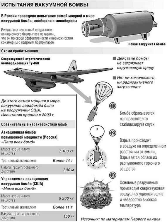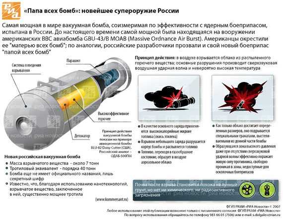 — Результаты испытаний созданного авиационного боеприпаса показали, что он по своей эффективности и возможностям соизмерим с ядерным оружием, — сообщил журналистам и.о. начальника Генерального штаба Вооруженных сил России генерал-полковник Александр Рукшин. — В то же время, я хочу это особо подчеркнуть, действие этой бомбы абсолютно не загрязняет окружающую среду по сравнению с ядерным боеприпасом.
