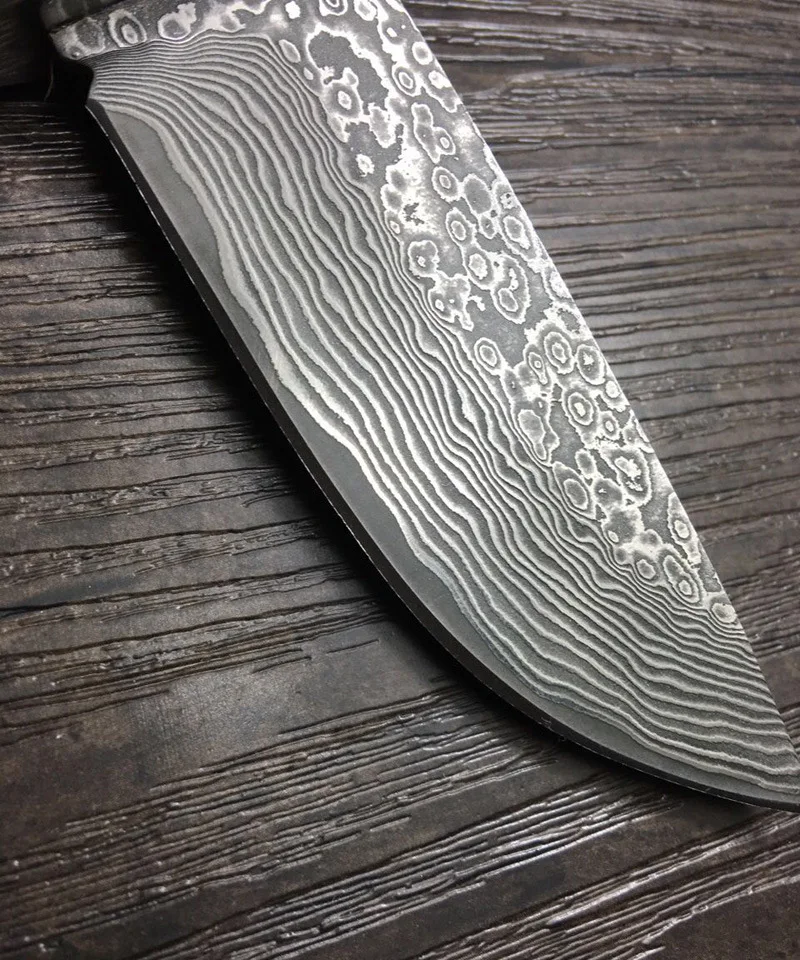Лезвие ножа изготовлено из крученой дамасской стали твердостью 61 HRC, прекрасно держит режущую кромку и имеет профиль Clip PointClip Point — острие при таком профиле обладает меньшей прочностью, чем у Drop-Point, но его проникающая способность при колющем ударе выше.Подробнее с сечением “hollow grind”.