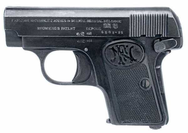 Производство Бельгия, образец 1906 года, калибр 6.35 мм. Вес всего 350 грамм, но имеет 6 патронов. И каких патронов! Патрон пистолета Макарова 9 мм и патрон Браунинга 6.35 мм Патроны создавались именно для этой модели. Пуля оболочечная, порох бездымный (в 3 раза мощнее дымного). Такой патрон был мощнее револьверного патрона того же калибра. Модель Браунинга 1906 г. была очень удачна. Размеры пистолета составляли всего 11.4 х 5.3 см и он легко умещался на ладони.