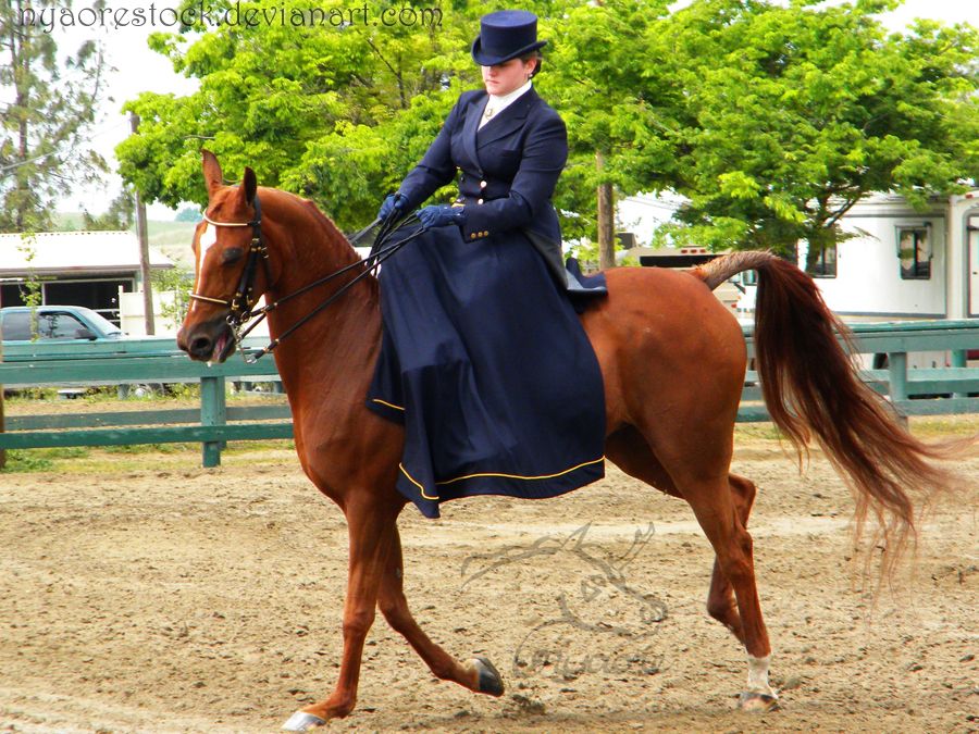 По-английски дамское седло называется боковым. Это связано с тем, что на первых дамских седлах приходилось сидеть боком. К мягкому сиденью-подушке приспособили дощечку, на которую дама могла поставить свои ноги. Активно ездить в таком седле было невозможно. И всадницу сопровождал мужчина, который вел лошадь под уздцы. Иногда дама ехала сидя боком позади кавалера, что и сейчас можно видеть в шоу испанских лошадей.