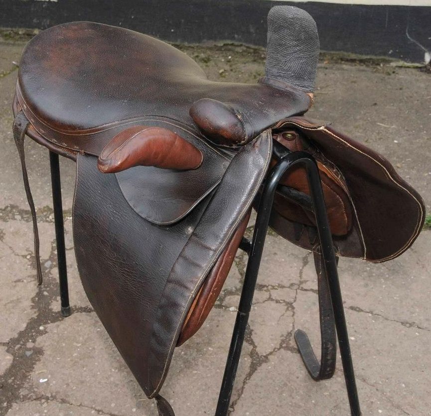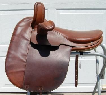 Это седло изготовлено из темной масляной кожи и весит 26 фунтов.