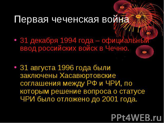 В конце 1994 года организованные Россией чеченские силы, дополненные российскими войсками, начали вторжение в Чечню. Они были легко побеждены, и Россия обострилась. 28 ноября 1994 г. российские самолеты уничтожили небольшую авиацию Чечни, и российские войска вторглись в Грозный. Грозный защищали 9000 бойцов, организованных Асланом Масхадовым. Первая волна русских насчитывала всего 6000 человек, и их атака началась 31 декабря.