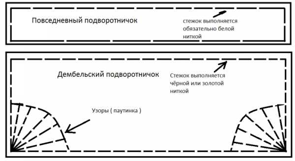 Воротник. В повседневное время на воротник солдата пришивается полоска белой ткани размером (если я не ошибаюсь) 24 см * 2 см в целях личной гигиены солдата, так как на белой ткани очень хорошо видна грязь. Дембельская «подшива» или подворотничок заметно отличается от повседневного