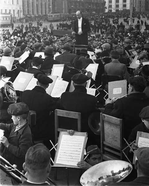 Взяв фотоаппарат, я вышел на улицу. Люди выбегали из домов. Они радостно поздравляли друг друга с долгожданной победой. Появились знамена. Народу становилось все больше и больше, и все двинулись на Красную площадь. Началась стихийная демонстрация. Радостные лица, песни, танцы под гармошку. Вечером был салют: тридцать залпов из тысячи орудий в честь великой Победы». (Военкор А. Устинов)
