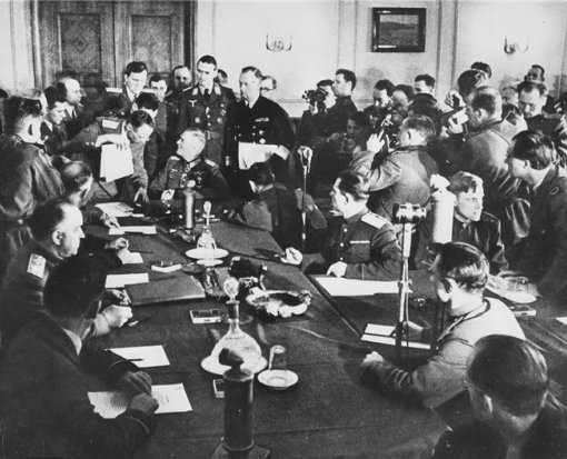 8 мая 1945 года в пригороде Берлина начальником штаба верховного главнокомандования генерал-фельдмаршалом В. Кейтелем от вермахта, заместителем Верховного главнокомандующего маршалом СССР Георгием Жуковым от Красной армии и маршалом авиации Великобритании А. Теддером от союзников, был подписан акт о безоговорочной и полной капитуляции вермахта.