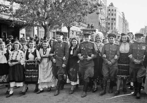 Жители Праги приветствуют советских освободителей (май 1945 года)