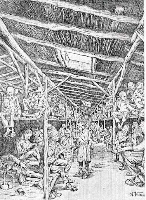Летом нас вывозили за город на берег реки, где стояли два больших плетеных сарая с воротами вместо дверей. Крыша текла, потолков не было. В таком сарае помещалось очень много детских кроватей. Кормили нас на улице под навесом. В этом лагере мы впервые увидели своего отца и не узнали его, убежали в «спальню» и спрятались под кроватью в самом дальнем углу.