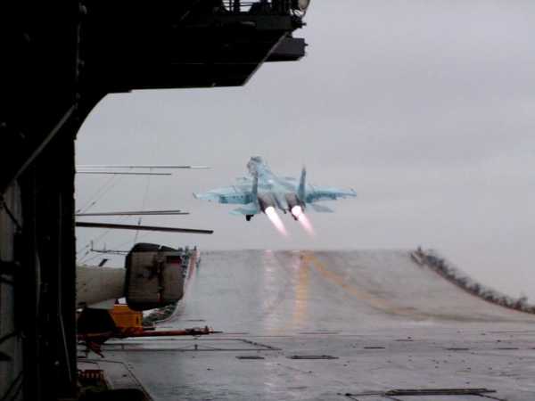 Су-27 Flanker со сложенными крыльями на борту Кузнецова.
