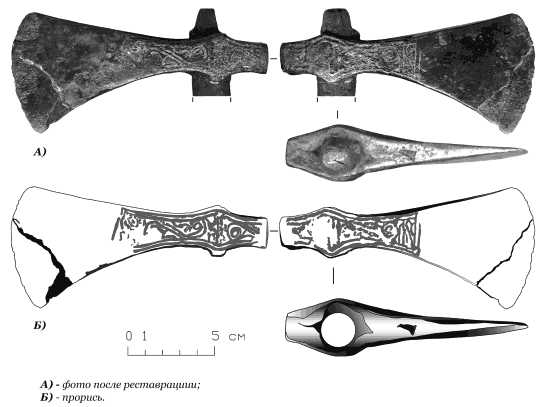 Рис. 2В процессе расчистки выяснилось, что топор имеет удлиненное, немного ассиметричное секторовидное лезвие со слегка опущенным углом, узкую шейку, круглую проушину с незначительно выступающими округлыми ушками-щековицами и несколько вытянутый и суженный к концу обух, оформленный в виде молоточка-чекана прямоугольного сечения. Боковые стороны обуха и шейки украшены инкрустированным «растительным» орнаментом из кусочков проволоки красновато-желтого цвета, вероятно, бронзовой или латунной, в виде эсовидных завитков, заключенных в окантовку из двойной линии. Размеры предмета следующие: общая длина – 149 мм, ширина в наиболее массивной части — 33 мм; максимальная высота лезвия — 70 мм, длина — 102 мм; высота шейки — 19 мм; размеры проушины — 20х26 мм, при общей высоте — 30 мм; размеры обушка-чекана — 16х16х18 мм (рис. 2; табл. 1).