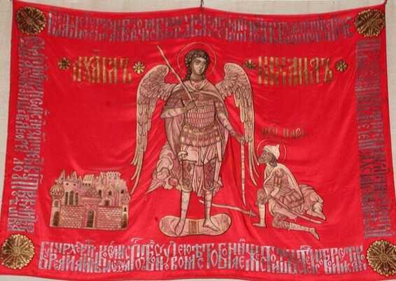 В 1612 году над ополчением, вышедшем из Нижнего Новгорода к Москве, развевалось знамя Дмитрия Пожарского. Оно было малинового цвета и на одной своей стороне несло образ Господа Вседержителя, а на другой — архангела Михаила. Народное ополчение под предводительством Козьмы Минина и Дмитрия Пожарского положило конец Смуте, освобождению от польско-литовского ига и освободило Москву от захватчиков. Враги и предатели России были изгнаны, а русская государственность восстановлена. Знамя князя Пожарского по наступлении мирного времени было помещено в церкви и почиталось наравне с иконами. В грозный год наполеоновского нашествия со знамени Пожарского была сделана точная копия и вручена Нижнегородскому ополчению.