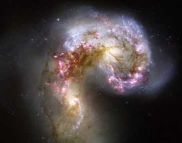Другие галактики прокладывают себе путь прямо сквозь центр своей напарницы, поднимая облака звезд и дымящиеся кольца газа. Получающиеся возмущения зачастую порождают чрезвычайно яркое свечение, поскольку в клубящихся облаках газа формируются новые звезды. Эти молодые голубые звезды могут быть окутаны космической сажей, и некоторые их области от этого светят красным, подобно тому, как пыль делает ярче закат солнца на Земле. Слияние галактик — потрясающее зрелище. Тем не менее подробности строения галактик остаются неясными. Чтобы уничтожить огромный диск звезд и оставить голый эллиптический балдж, потребовалось бы катастрофическое столкновение, а, чтобы галактика образовала достаточных размеров диск, не разрушаясь, требуется постепенное мягкое приращение. Астрономы видят лишь немногие галактики в промежуточных состояниях, и истинная картина того, как именно галактики меняются через слияние, скорее всего, очень сложна.