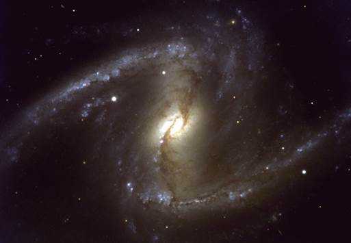 На следующей фотографии показана NGC 1365 (Рис. 3) — своеобразная «классика» спиральной галактики. Эта массивная галактика имеет диаметр в 200,000 световых лет и удалена от нас на 60 миллионов световых лет. Это одна из галактик из звездного скопления Fornax . Через центр галактики проходит преграда, которая охватывает ее ядро. Это целая система из спиральных рукавов и преград вращает медленно по часовой стрелке и проходит 350 миллионов лет, чтобы завершить один полный поворот. Подобно многим спиральным галактикам центральная область ее состоит из старших, более красных звезд. Спиральные рукава содержат молодые синие звезды