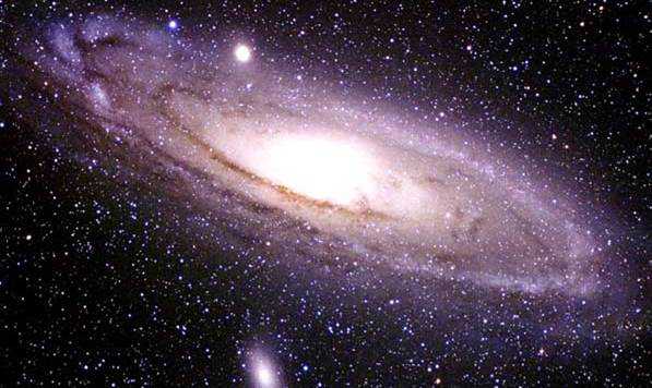 Галактика Андромеда — один из самых близких наших галактических соседей. В промежутке в 2,3 миллиона лет — один из самых далеких объектов, видимых невооруженным взглядом. Андромеда содержит 300 миллиарда солнц и охватывает 130,000 световых лет, что почти вдвое массивней нашей собственной галактики. Галактика — превосходный пример спиральной и предполагается, что наша собственная галактика имеет очень похожую структуру. Андромеда имеет две большие галактики — M32 и M110 , которые видны на Рис. 5.