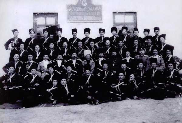 кубанские казаки — черная или так называемая сиреневая черкеска с газырями, пояс наборной кавказский, черные шаровары с малиновым полулампасом, папаха или кубанка (у пластунов) с малиновым верхом, малиновые погоны и башлык, кинжал ККВ, шашка ККВ уставная кавказского образца