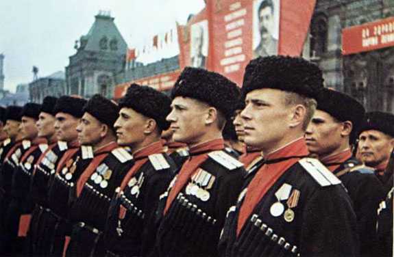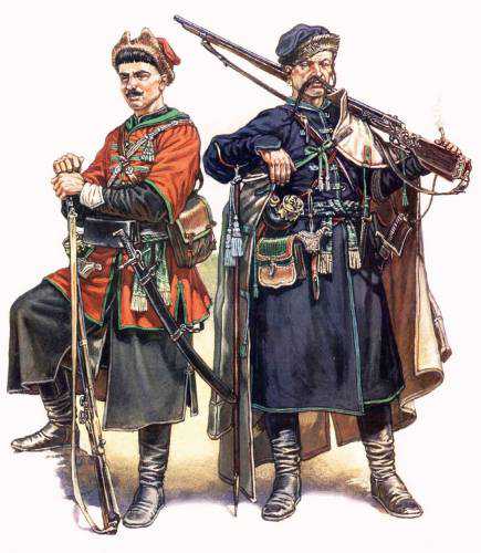 кубанские казаки — черная или так называемая сиреневая черкеска с газырями, черные шаровары с малиновым полулампасом, папаха или кубанка (у пластунов) с малиновым верхом, малиновые погоны и башлык. То же у терских казаков, только цвета светло синие