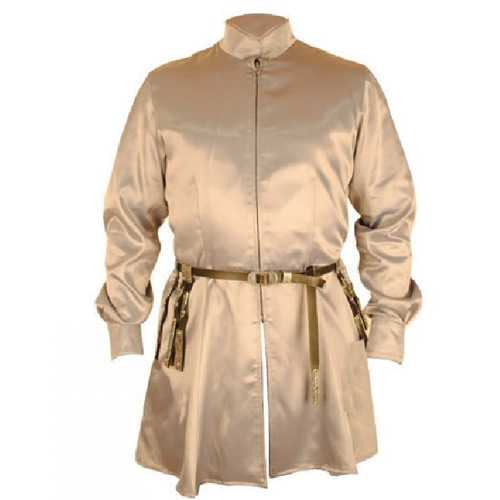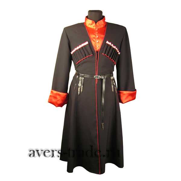 бешмет до колен или короче с закрытой грудью, с цельными передними полами, правая поверх левой, с мягким воротником и с застежками на крючках посредине груди, при спине по талии-обрезной и с двумя-тремя парами складок от пояса вниз, со свободными рукавами;