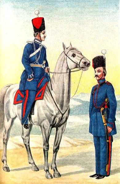 Офицерам — шапки прежней формы, но без этишкетов; патронташи (вместо лядунки) на 20 патронов из черного сафьяна, с такой же крышкой и с перевязью из серебряной тесьмы, без просвета, подложенной, черным сафьяном; пистолеты по образцу офицерских в легкой кавалерии; пистолетные чушки из черного сафьяна; пистолетные шнуры серебряные; верхнюю часть пистолетных чехлов до замка из сукна по цвету воротника, а нижнюю из черного сафьяна; портупеи из серебряной тесьмы, без просвета, подложенные черним сафьяном; шашки (вместо сабель) с рукоятью, гайками, кольцами и наконечниками вызолоченными, в деревянных ножнах, обтянутых черным сафьяном; вальтрапы и подушки на седла по цвету мундира, подбитые черным опойком и обложенные (первые по краям, а последние вокруг по шву) тесьмой, по цвету мундирных кантов, шириной в 3/4 в-ка, длиной на передних углах в 5 1/2, на задних же в 9 в-ков; чемоданы из серого сукна, длиною в 12, а по окружности в 9 в-ков, с кожаным подбоем и с 4 серебряными пуговицами с выпуклым изображением номера полка (рис. 1079, 1080, 1081 и 1082).
