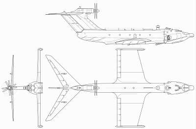Силовая установка. Включает два стартовых турбореактивных двигателя НК-8-4К (статическая максимальная тяга 10.5 т) и маршевый турбовинтовой КН-12МК (статическая максимальная тяга 15.5 т). Поворотные сопла стартовых двигателей позволяют направить реактивные струи под крыло в режиме поддува (на взлете или посадке), или над крылом при необходимости увеличения тяги в крейсерском полете. Запуск двигателей осуществляется с помощью вспомогательной силовой установки ЕА-6А. Топливные баки располагаются в корневых частях крыла.