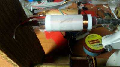 далее мотаем последний слой-100 вит(всего должно получиться 11 слоев 9 по 260 вит,первый1 160,и последний 100),оформляем вывод и кладем межобмоточную изоляцию-3 слоя фторопласта).Конечный диаметр вторичной обмотки-17 мм(!!!)