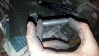 Поэтому при помощие наждака пришлось обточить его до диаметра 10мм.Черной пыли будет дохуя-такчто если очень сильно ненавидите свою жену,можете сделать это в ее присутствии(ОПАСНО),или же непосредственно перед приходом )))).После чего необходимо обрезать его до длины 40 мм.И многие обломались именно на этом моменте )).Думаете подпилите напильником,въебете молотком и он разломится там где вам надо?А вот хуй!.Расколется он там где ему захочется,возможно в нескольких местах :).Поэтому делаем следующим образом-надфилем делаем круговой надпил по всему диаметру стержня,после чего берем плоскогубцы или кусачки тонкой частью(которой кусают проволоку)хватаем место надпила и сдавливаем.Вуаля-стержень разваливается на 2 ровные половинки.