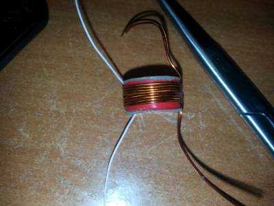 После завершения намоточного процесса необходимо обрезать провод,залудить конец и опятьже припаять многожильный вывод,после чего изолировать место пайки.я вначале изолировал последний слой,потом обрезал провод,напаял вывод и намотал сверху 2 слоя обычной изоленты(межобмоточная изоляция).Далее берем провод диаметром около 0.6-0.8 мм(я вынул с какогото сетевого транса),обрезаем 2 куска складываем их вместе и мотаем 4 витка