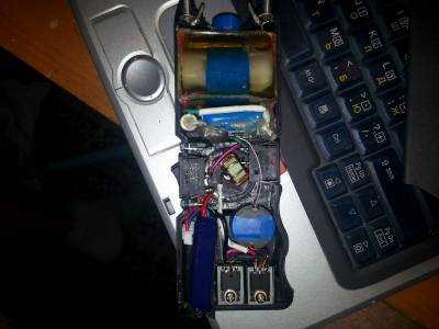 В качестве корпуса был использован корпус от китайского шокера TW10..т.к это чудо китайской инженерной мысли клееное разбирать пришлось при помощи ножа.Попутно был обломан 1 из выходных электродов т.к они сделаны из какогото галимого пресс.порошка.Кнопку пуска-220В 6А решено было оставить,китайский переключатель отвечающий за пищалку и фонарик заменил на нормальный выключатель 220в 10А(от БП компа).на место бывших индикаторов путем сверления корпуса были установлены 2 сверхярких белых светодиода(подключены к акуму через резистор 40 ом)-одновременно импровизированный фонарик и индикатор готовности.На место выходных электродов были заплавлены в корпус 2 согнутые стальные заклепки.Высоковольтный блок спаян навесом и установлен рядом с вв трансом