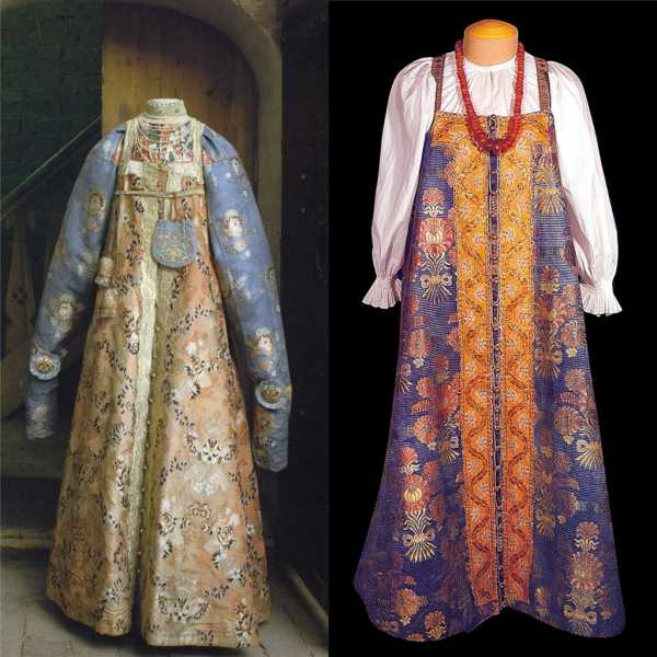 В XVII веке, в центральных районах России, поверх рубахи начали носить сарафан. Именно он ассоциируется в России с национальным костюмом. Существовало три основных типа сарафана: косоклинный, прямой, сарафан с лифом. Наиболее ранними считались косоклинные сарафаны. Шились они из домотканого шерстяного материала черного, темно-синего или красного цветов. Их подолы были богато украшены красным сукном, лентами, блестками и золотой тесьмой. «Прямой» сарафан состоял из четырех или пяти прямоугольных полотнищ, которые были собраны на груди и спине под обшивку и удерживались на плечах лямками, без застежки. Носили их, в основном, в праздники.