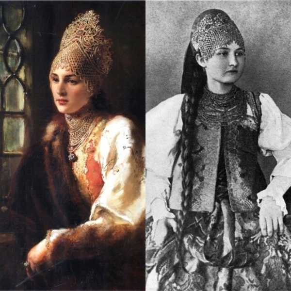 На Руси существовал общий для славян древний обычай, по которому всюду девичий головной убор отличался от головного убора замужней женщины, так же, как и прическа. Девушка могла носить волосы распущенными или заплетать их в одну косу, а замужняя женщина должна была заплетать две косы и по обычаю не имела права показываться с непокрытой головой. Отсюда специфические формы головного убора — у женщины покрывающие волосы, у девушек оставляющие их открытыми. Наиболее распространенный вид русского праздничного головного женского убора — кокошник — род плотной твердой шапочки. Это название образовано от существительного кокошь – «наседка» и дано по внешнему сходству убора с куриным гребнем. Кокошник носили с сарафаном. Кокошники XVIII — начала XIX вв. искусно расшиты речным жемчугом, украшены плетеными жемчужными и перламутровыми поднизями (рясками – бисерными сетками, бахромой на лобной части женского головного убора), золотосеребряным шитьем, цветной фольгой, гранеными стразами. Головные уборы хранились в семьях, передавались по наследству из поколения в поколение и были непременной частью приданого зажиточной невесты.
