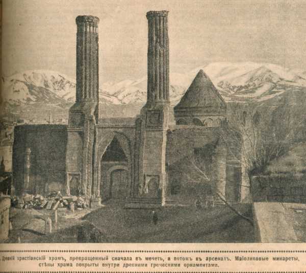 Древний христианский храм, превращённый турками в арсенал.Освобождённый Эрзурум, 1916Главная система Эрзерумских укреплений представляла собой труднопроходимые горы, умело оборудованные мощными фортификационными сооружениями.