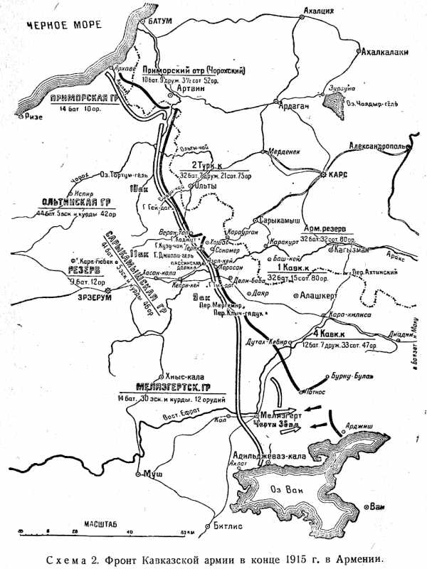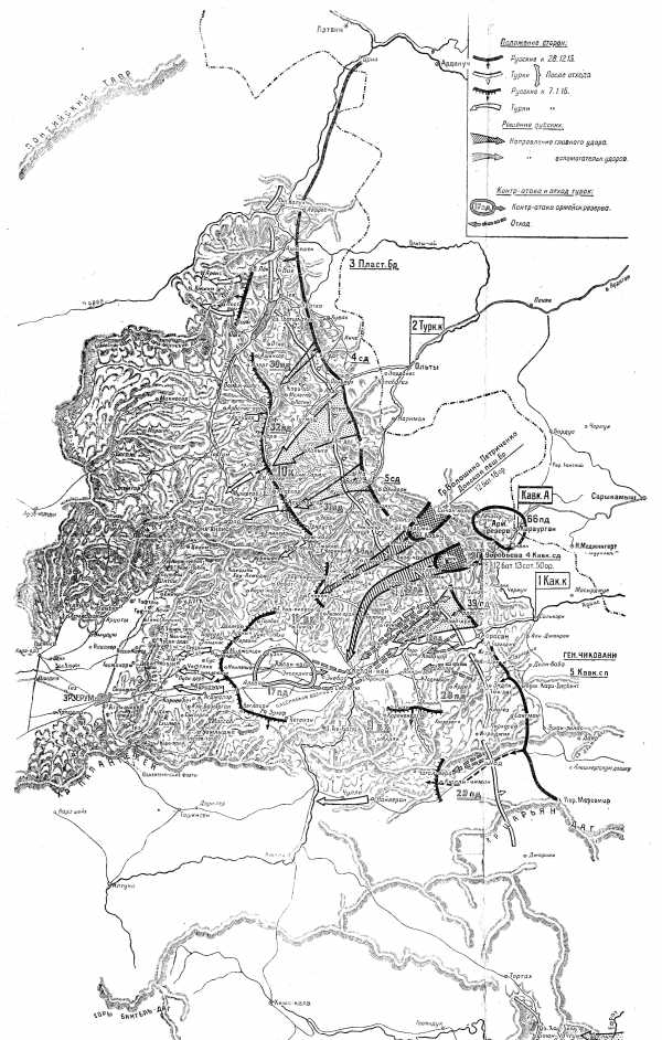 Начатая 28 декабря 1915 г. и закончившаяся к 12 марта 1916 г. семидесятипятидневная операция, называемая по конечному итогу ее Эрзерумской, состояла из двух самостоятельных и последовательных операций, имевших определенно поставленные цели: первая — нанесение коротким ударом поражения живой силе турок, а вторая — окончательный разгром 3-й турецкой армии, укрывшейся за верками крепости Эрзерум, и овладение последней. В общем Эрзерумская наступательная операция, проведенная в тяжелых зимних условиях на горном театре, представляет один из примеров доведенной до конца сложной операции, состоявшей из нескольких, вытекавших один из другого, этапов, закончившихся разгромом противника, потерявшего свою основную базу на передовом театре — крепость Эрзерум.