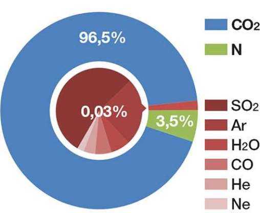 - Газовый состав планеты: 96% — углекислый газ, остальные 4% — азот, угарный газ (CO), сернистый газ (SO2), кислород и водяной пар.