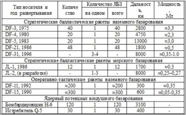 Чаще всего приводимые значения количества китайских межконтинентальных баллистических ракет (МБР – 30 DF-31/31А, 24 DF-5), баллистических ракет средней дальности (БРСД – 20 DF-4, 30 DF-3A, 90 DF-21/21А) и оперативно-тактических и тактических ракет (ОТР/ТР – 600 DF-11, 300 DF-15) на самом деле вряд ли являются даже нижним пределом величин. Оценки производственных возможностей китайского ВПК и наличие в Центральном Китае огромной системы подземных тоннелей для укрытия МБР говорят о том, что КНР может иметь до тысячи только МБР и как минимум не меньшее количество БРСД. Относительно общего числа ядерных зарядов различной мощности и назначения вряд ли речь идет о величине меньшей, чем пять тысяч единиц (включая, разумеется, авиабомбы), учитывая, что их производство в КНР ведется уже более 40 лет.