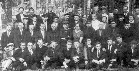 Группа работников Ковровского пулеметного завода в период разработки первого унифицированного семейства оружия на основе автомата Федорова. Во втором ряду: 5-й слева – начальник опытной мастерской В. А. Дегтярев, 6-й слева (в инженерной фуражке) – начальник ПКБ завода В. Г. Федоров. В третьем ряду: 2-й слева – конструктор С. Г. Симонов, 7-й слева – слесарь-отладчик Г. С. Шпагин.
