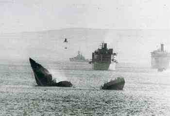 - ↑ Девять из них были сбиты «Харриерами», два — корабельными ЗРК, два — непосредственным огнём с кораблей, один — «Стингером» с земли. Согласно воспоминаниям Дж. Вудворда, особо отличился вольнонаёмный менеджер корабельного буфета «Ардента», ветеран британской армии Джон Лик. В момент, когда корабль был охвачен пламенем, а расчёт зенитного автоматического орудия погиб, он пробрался к орудию и открыл огонь, подбив «Скайхок», который позже разбился при вынужденной посадке.