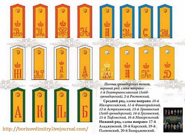 Основным характерным признаком полка были погоны с цветным кантом и шифровками. Цветная сторона погона в гренадерских полках была ярко-желтого цвета. Она служила подложкой для золотого галуна на офицерских погонах в первых двенадцати полках и для серебряного в остальных восьми. Шифровки на погонах нижних чинов были красного цвета, на офицерских погонах — золотые или серебряные в зависимости от цвета полковых пуговиц. Пуговицы в первых двенадцати полках были золотые, в остальных восьми — серебряные.
