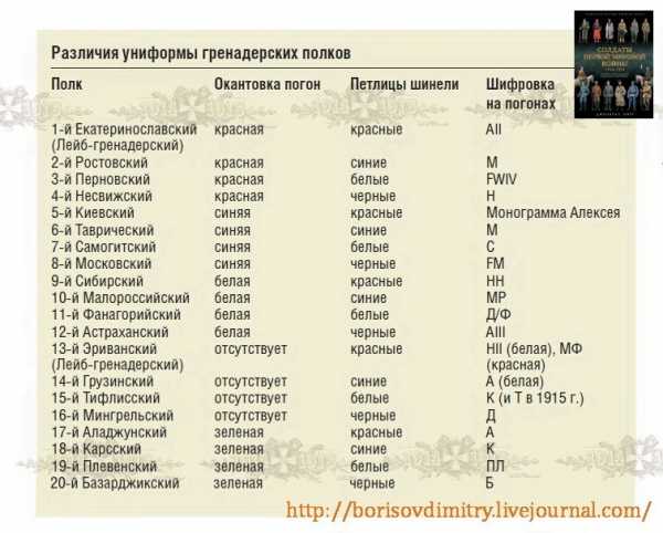 Сначала новобранцев отбирали по росту и физическим данным. Отбор в 1-й и 13-й полки, известные как лейб-гренадерские, был еще более сложным. В 1914 г. Солдаты гренадерских полков носили форму, напоминавшую форму их коллег из линейных пехотных частей. Их походные фуражки имели козырьки и императорские кокарды. Однако иногда на фронте носили варианты мирного времени — без козырька и с яркими околышами, а также пилотки (ближе к концу войны. — Прим. ред.). В гренадерских