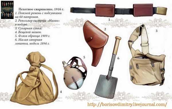 Снаряжение русского пехотинца было довольно простым. Ранцы обычно не использовались — они доставались гвар-дейцам. Солдаты носили коричневые или черные ремни с пряжками с рисунком в виде двуглавого орла. С обеих сторон пряжки располагалось по одному коричневому подсумку (образца 1893 г.) по 30 патронов в каждом. Иногда использовались бандольеры с дополнительным запасом патронов. Большинство солдат имели котелок или алюминиевую флягу на лямке, саперную лопатку (конструкции Линнемана с кожаным футляром) и сухарную сумку или вещевой мешок (например, образца 1910 г.) из легкого коричневого или белого полотна. В нем находились запасные обоймы и личные вещи. Противогазы вошли в употребление в конце 1915 г. Это могли быть как противогазы, ввезенные из государств-союзников, так и противогазы Зелинского (первый эффективный противогаз с угольным фильтром) в алюминиевом контейнере.
